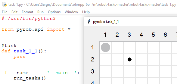 #!/usr/bin/python3 from pyrob.api import * @task def task_1_1(): #pass mr(2) # Пройти 2 клетки вправо или: move_right(2) md(1) # Пройти 1 клетку вниз или: move_down(2) if __name__ == '__main__': run_tasks()